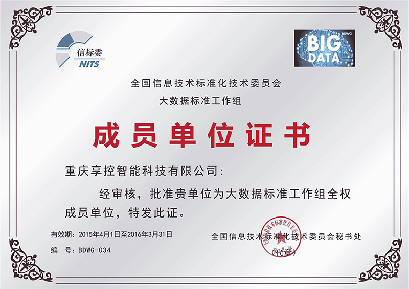 全國信標委批準重慶享控智能科技有限公司為“大數(shù)據(jù)標準工作組全權成員單位”